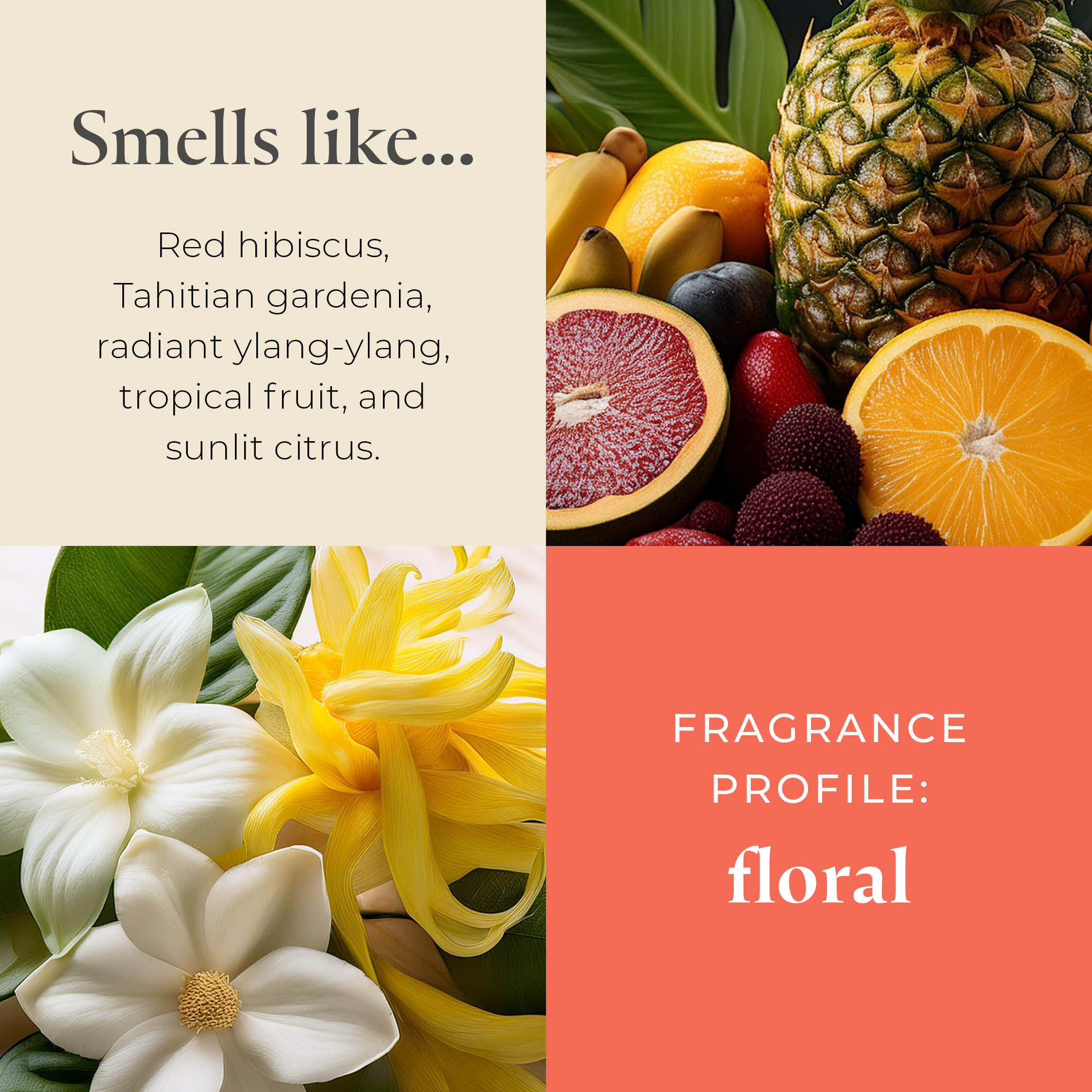 Experience the tropical escape of our Beachside Tiare 3-Wick Jar Candle. This captivating fragrance blends red hibiscus, Tahitian gardenia, and radiant ylang-ylang with hints of tropical fruit and citrus, creating a lush, beach-inspired scent. Presented in colorful wax with a stylish decorative sleeve and matching lid, this candle's three wicks ensure an even and rich fragrance release.