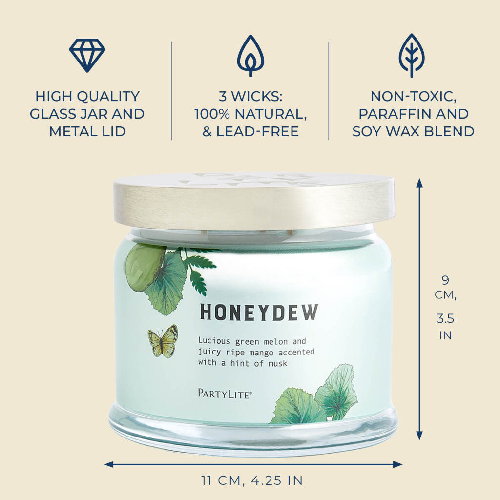 Take a bite of Honeydew and refresh yourself with our 3-Wick Jar Candle, filled with premium clean-burning wax. Luscious green melon and juicy ripe mangoes are accented with a hint of musk.