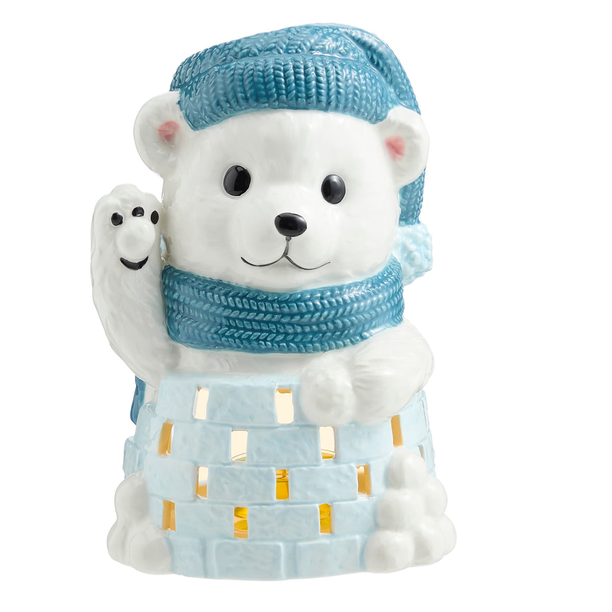 Bring a touch of winter whimsy to your home with this hand-painted tealight holder. Featuring a cheerful polar bear in a teal hat waving from behind a snowbrick igloo, this charming figure plays alongside the Winter Fun Snowman. A delightful addition to your seasonal décor, full of playful spirit and cozy glow.